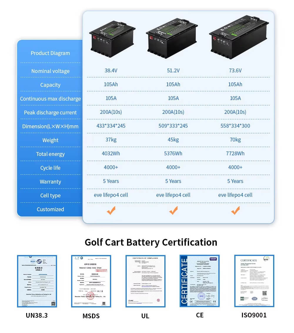 | יישום | עגלת גולף 【אנו מספקים גם סוללות כוח למלגזות, כלי רכב תעשייתיים (VGA), טרקטורונים, UTV וכן הלאה.】 | |||