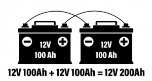 בתמונה למטה יש שניים סוללות 12 וולט מחובר בסדרות שהופך את בנק הסוללות הזה למערכת 24 וולט. אתה יכול גם לראות שלבנק עדיין יש דירוג קיבולת כולל של 100 אה.